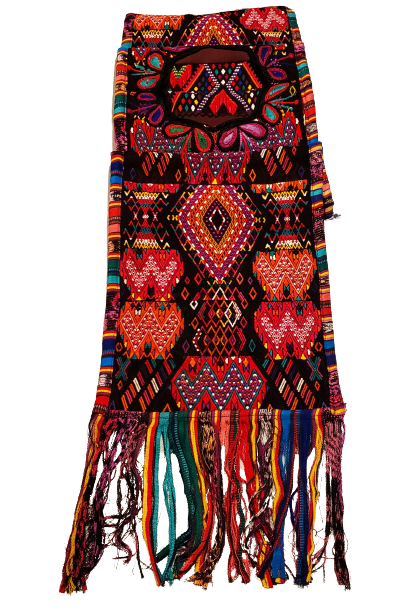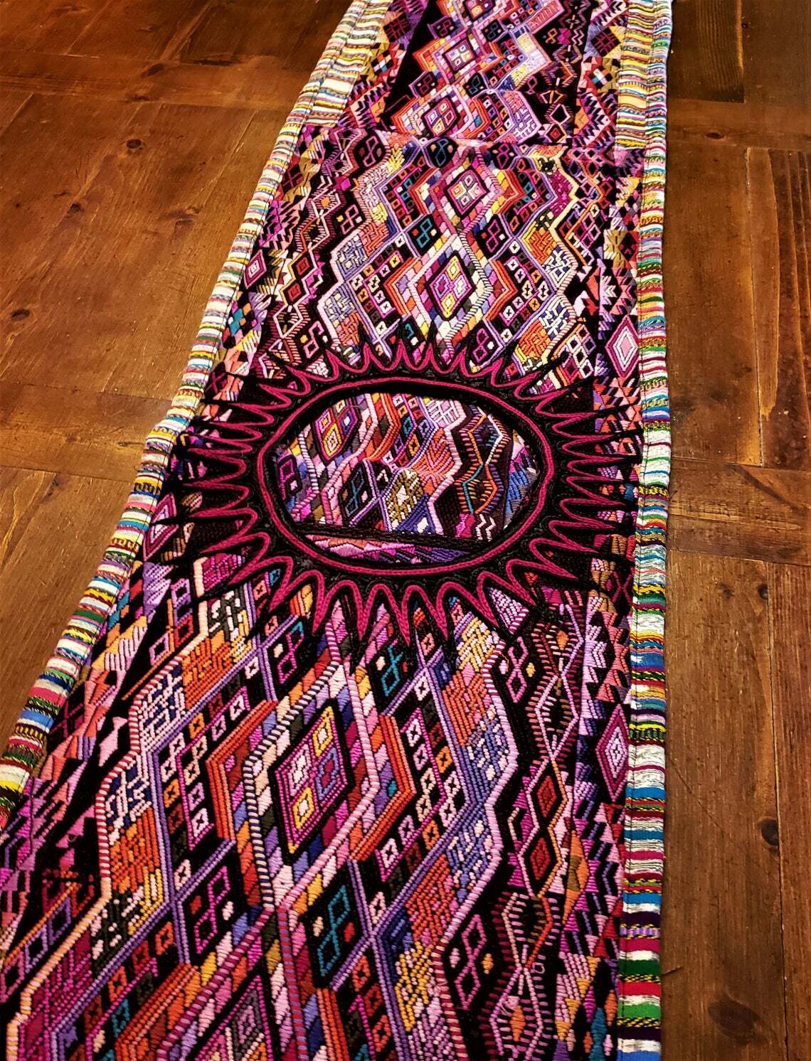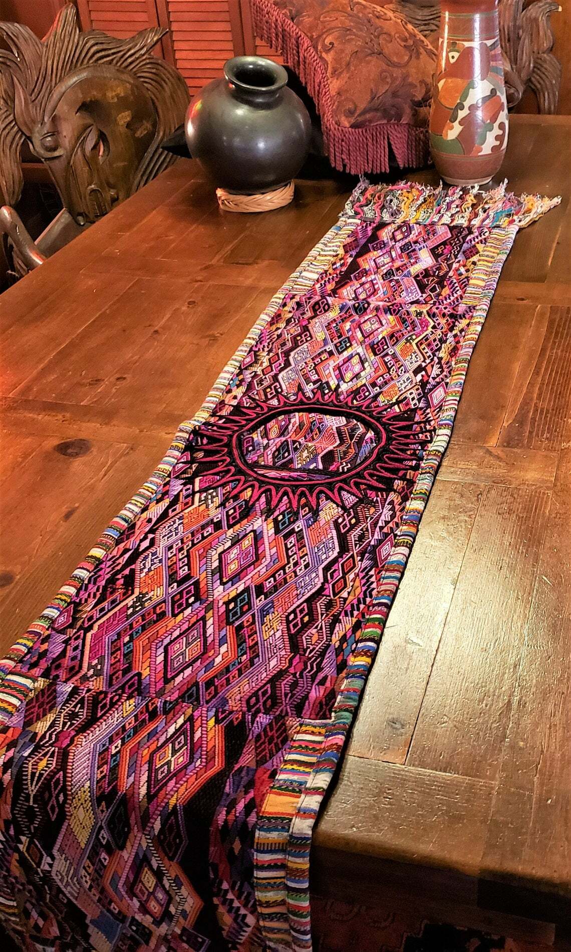 Colorful Huipile table runner from Chichicastenango, Guatemala. Bright Pastels & Jewel Tones. Woven by hand on a backstrap loom this elegant table runner features traditional Mayan designs with an embroidered "sunburst" center. Each is an absolutely unique example of Mayan textile art.