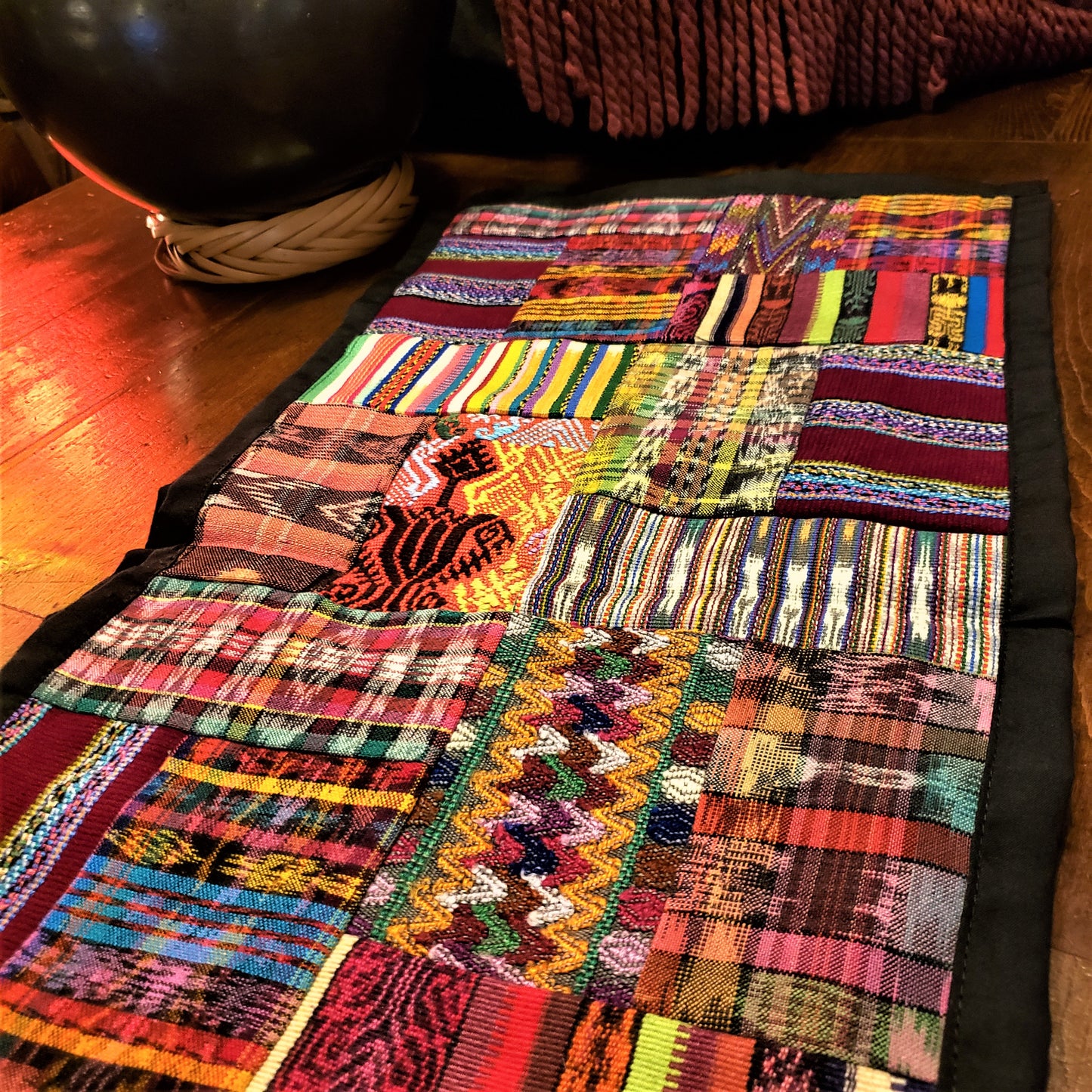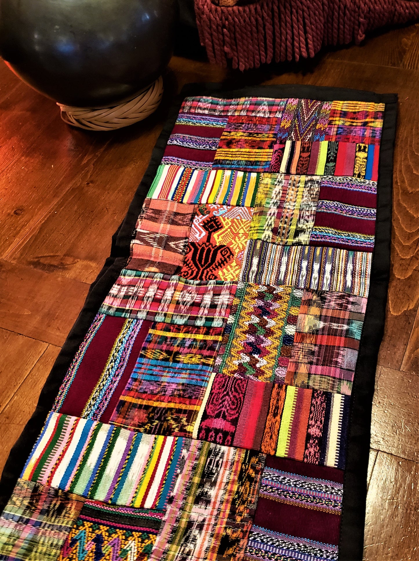 Hand Embroidered Patchwork Huipile Table Runner from Guatemala. 53 x 12 inches. Cotton. Beautiful bright colors. Each is quite unique. Mayan Huipile Design.
