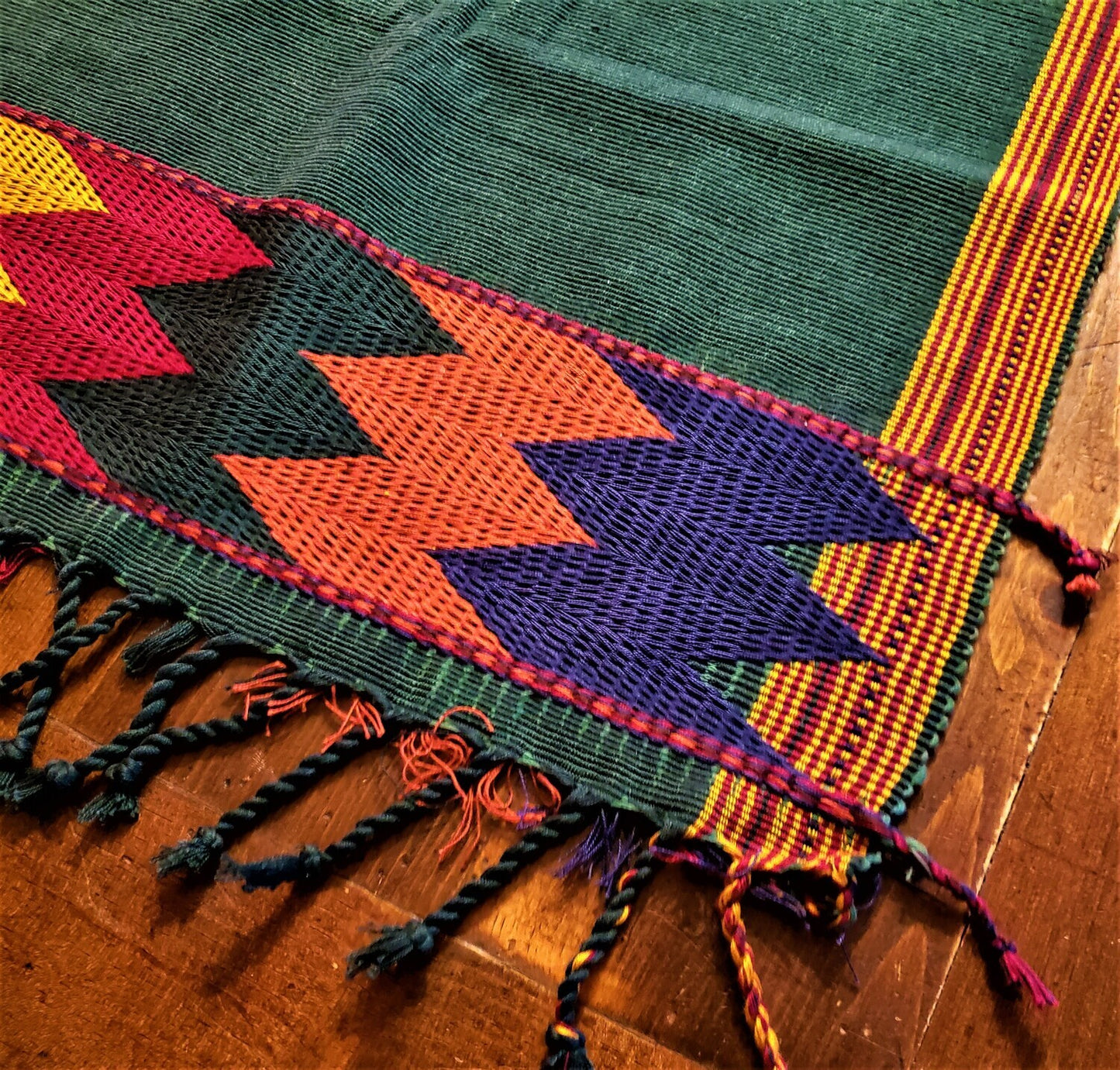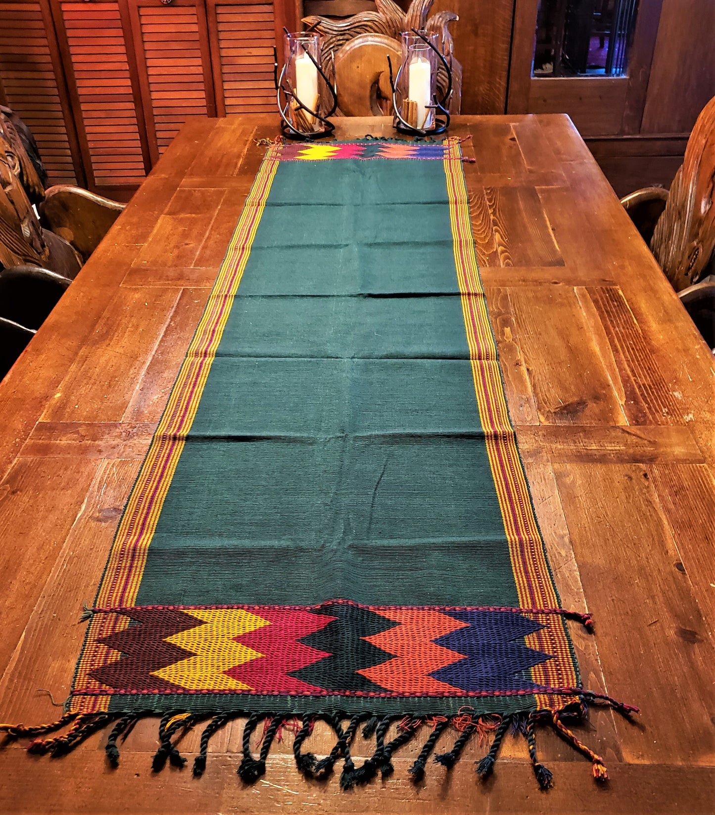 Handmade Green Zacualpa Table Runner. Approx. 60 x 18 inches. Beautiful Forest Green with woven decorative bands at the top, bottom and running along the sides. Fringes. Cotton. Fair Trade from our Guatemalan artisan cooperative.