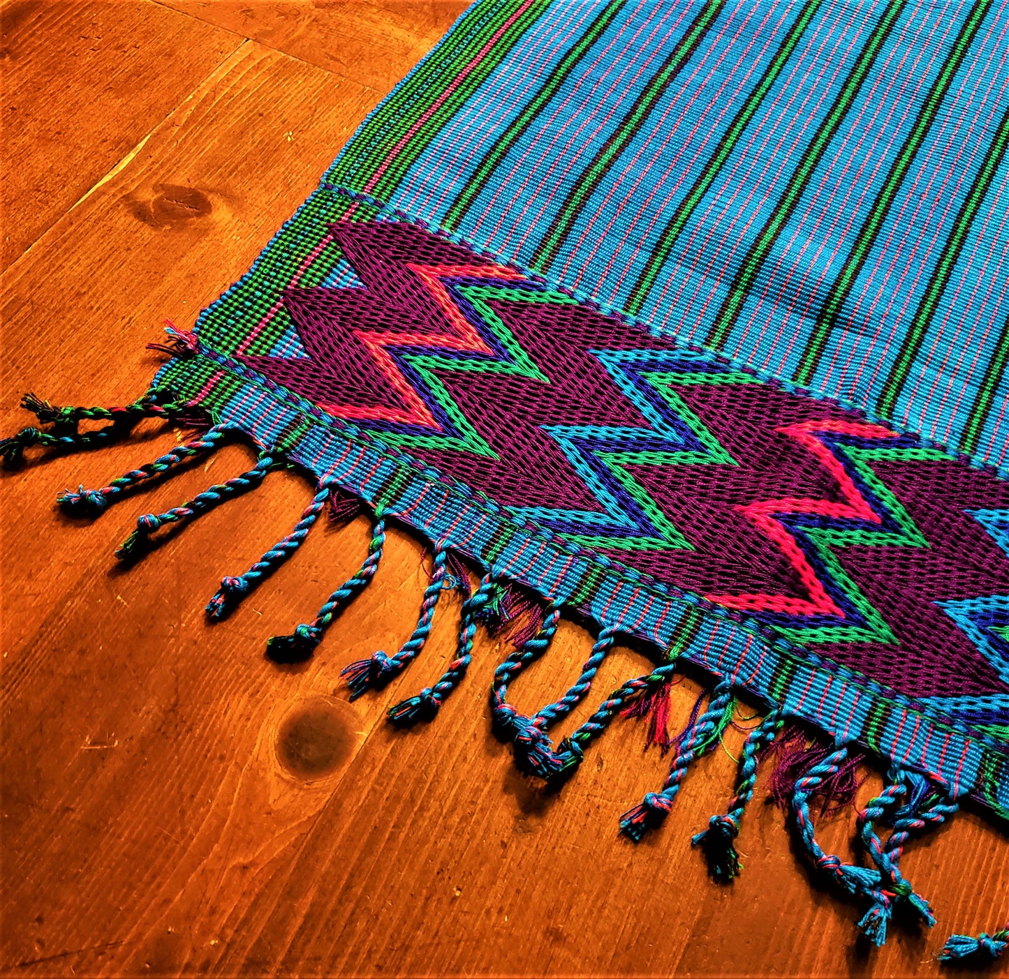 Guatemalan Handmade Blue Zacualpa Table Runner. Approx. 60 x 18 inches. Beautiful Vivid Blue with woven decorative bands at the top, bottom, and running along the sides. Fringes. Cotton.