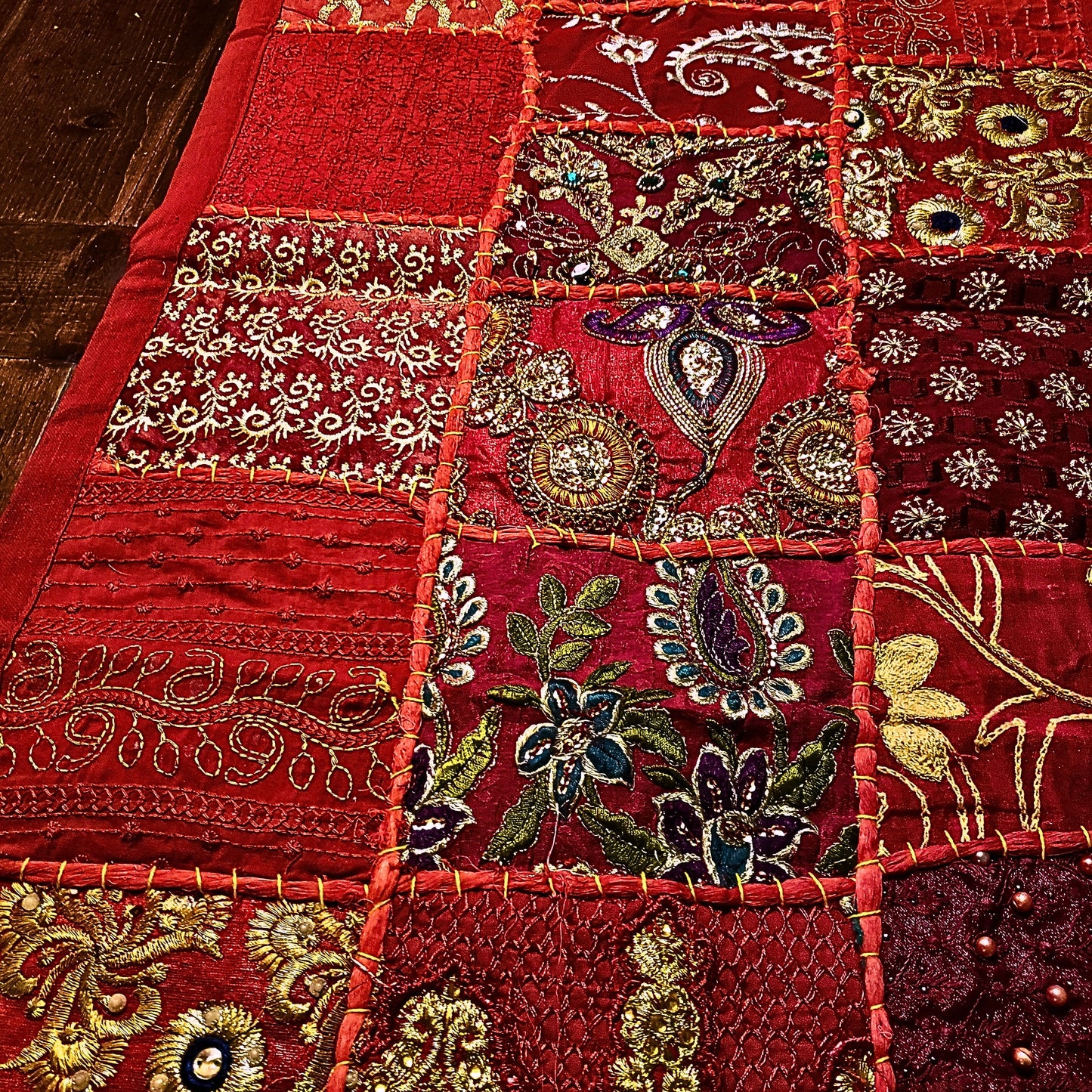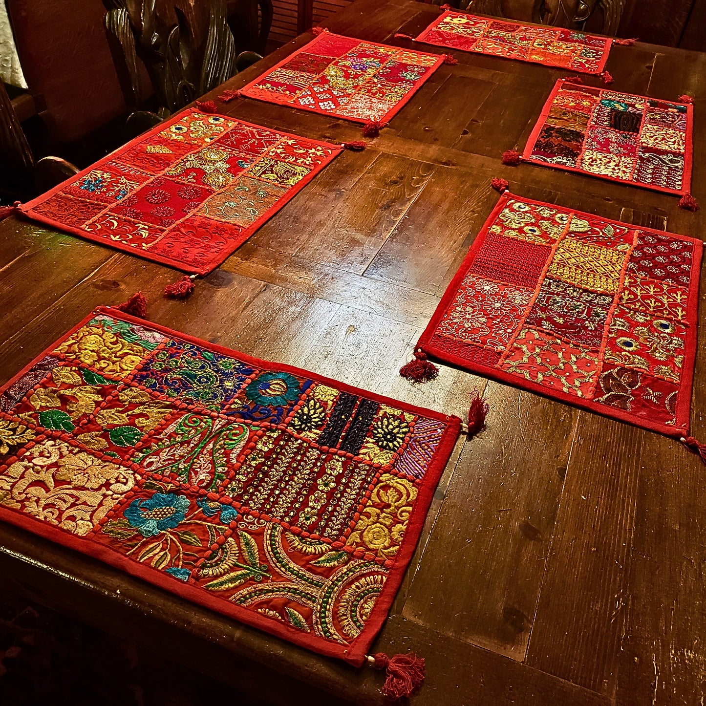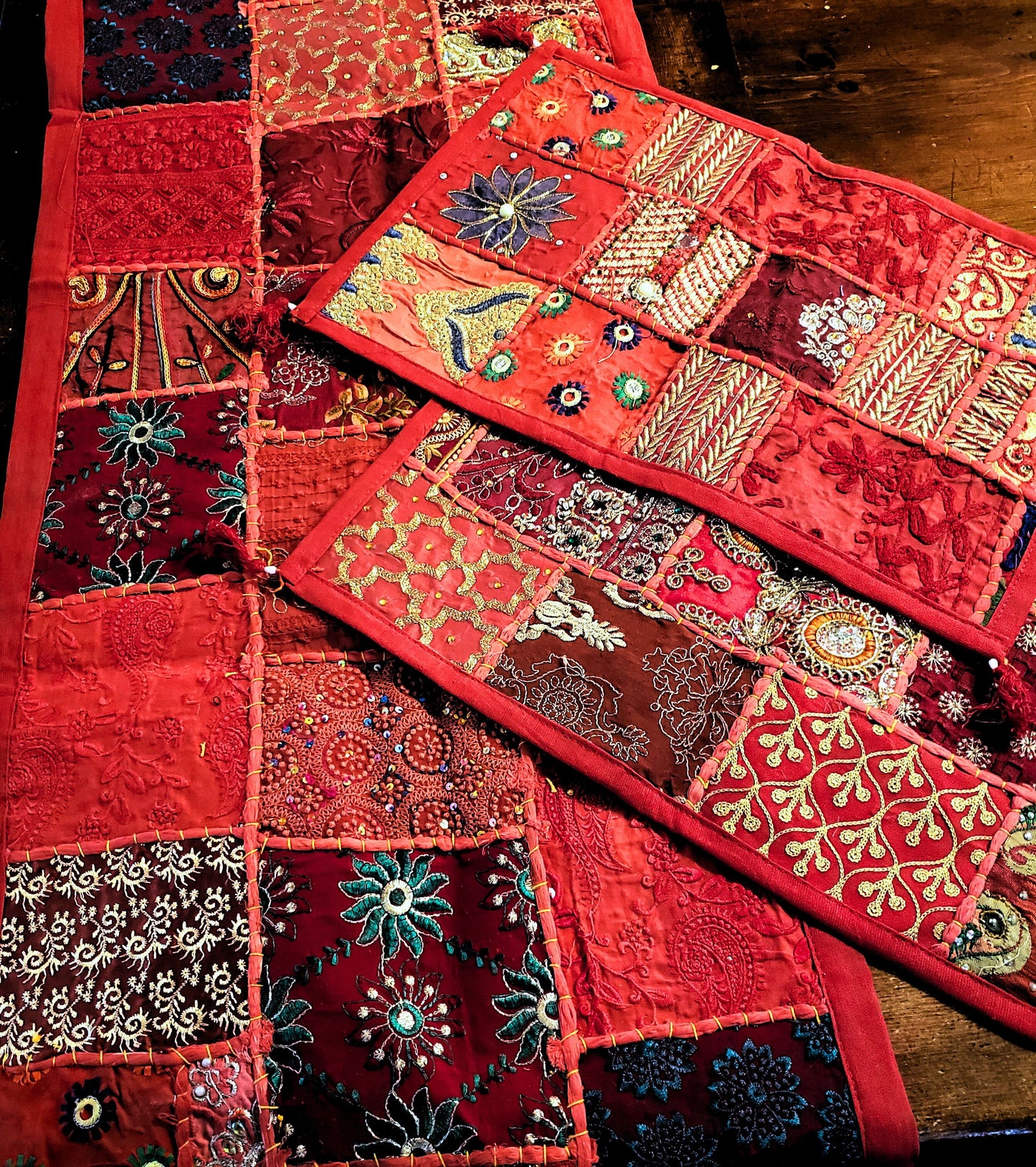 Handmade Gujarat Embroidered & Jeweled Table Runner & 6 Matching Placemats Set -Red Tones