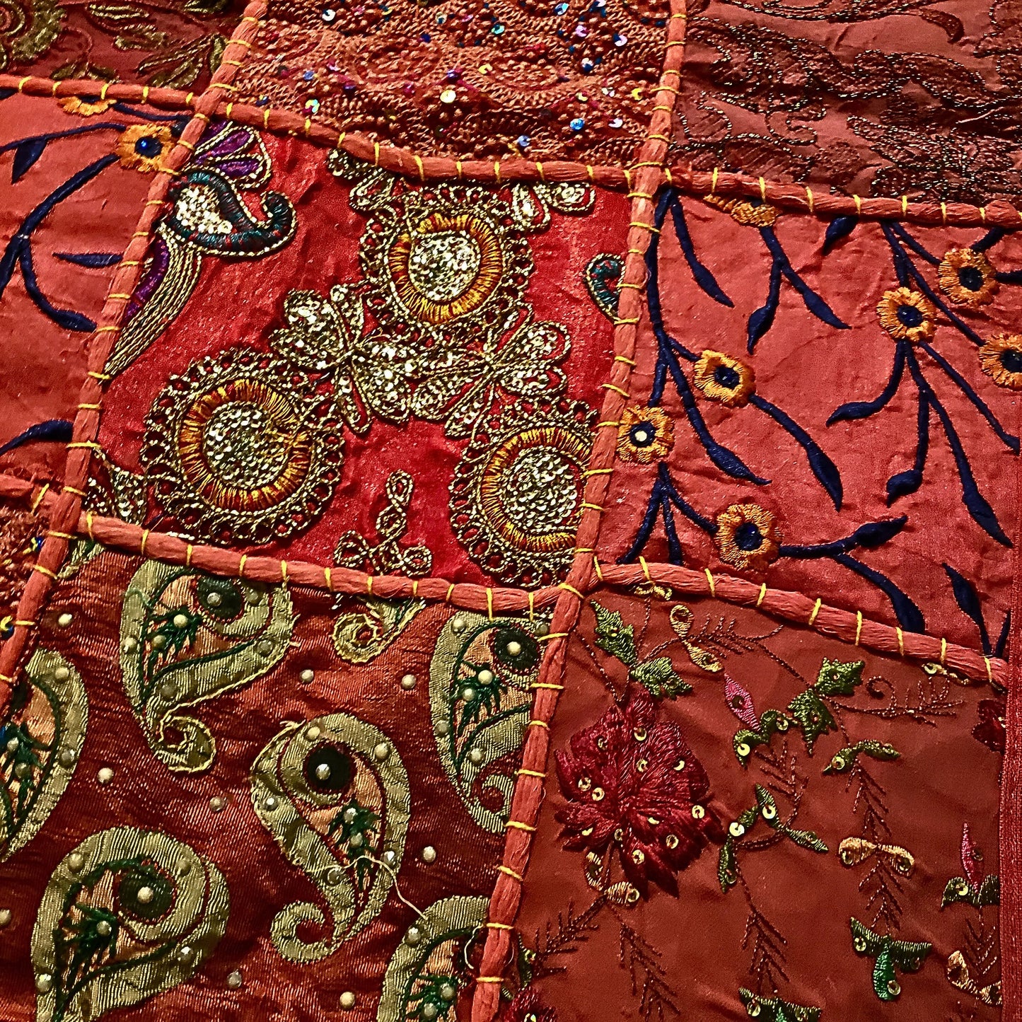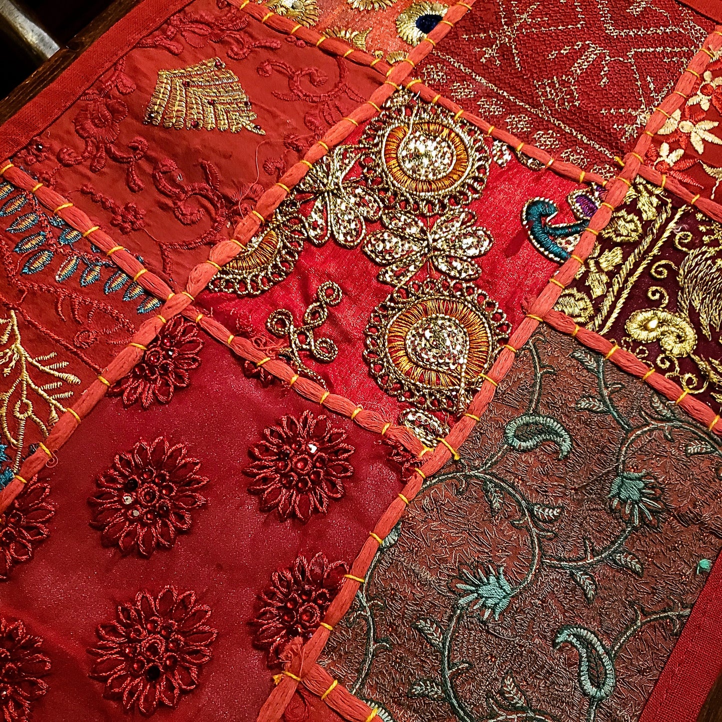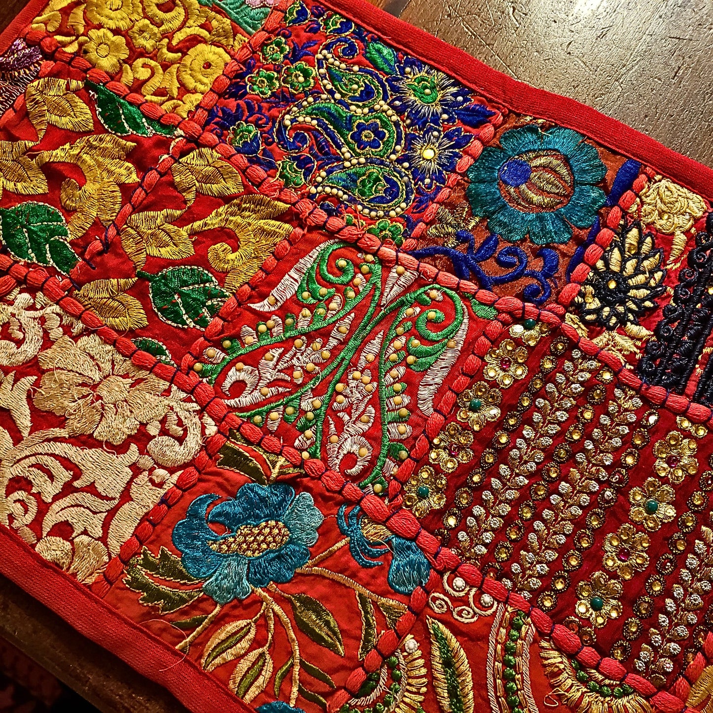 Handmade Gujarat Embroidered & Jeweled Table Runner & 6 Matching Placemats Set -Red Tones