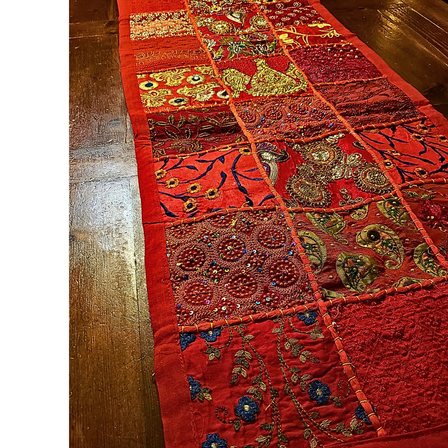 Beautiful 72 Inch Handmade Gujarat Embroidered & Jeweled Table Runner & 6 Matching Placemats Set from India. Red and Rose tones. Zardosi and Gujarati embroidery. The table runner is 72 x 16 inches, and the 6 placemats are 19 x 13 inches. Each set is unique but quite similar to the examples pictured. Cotton backing.